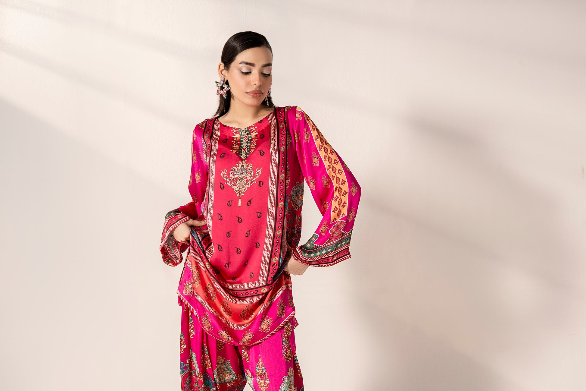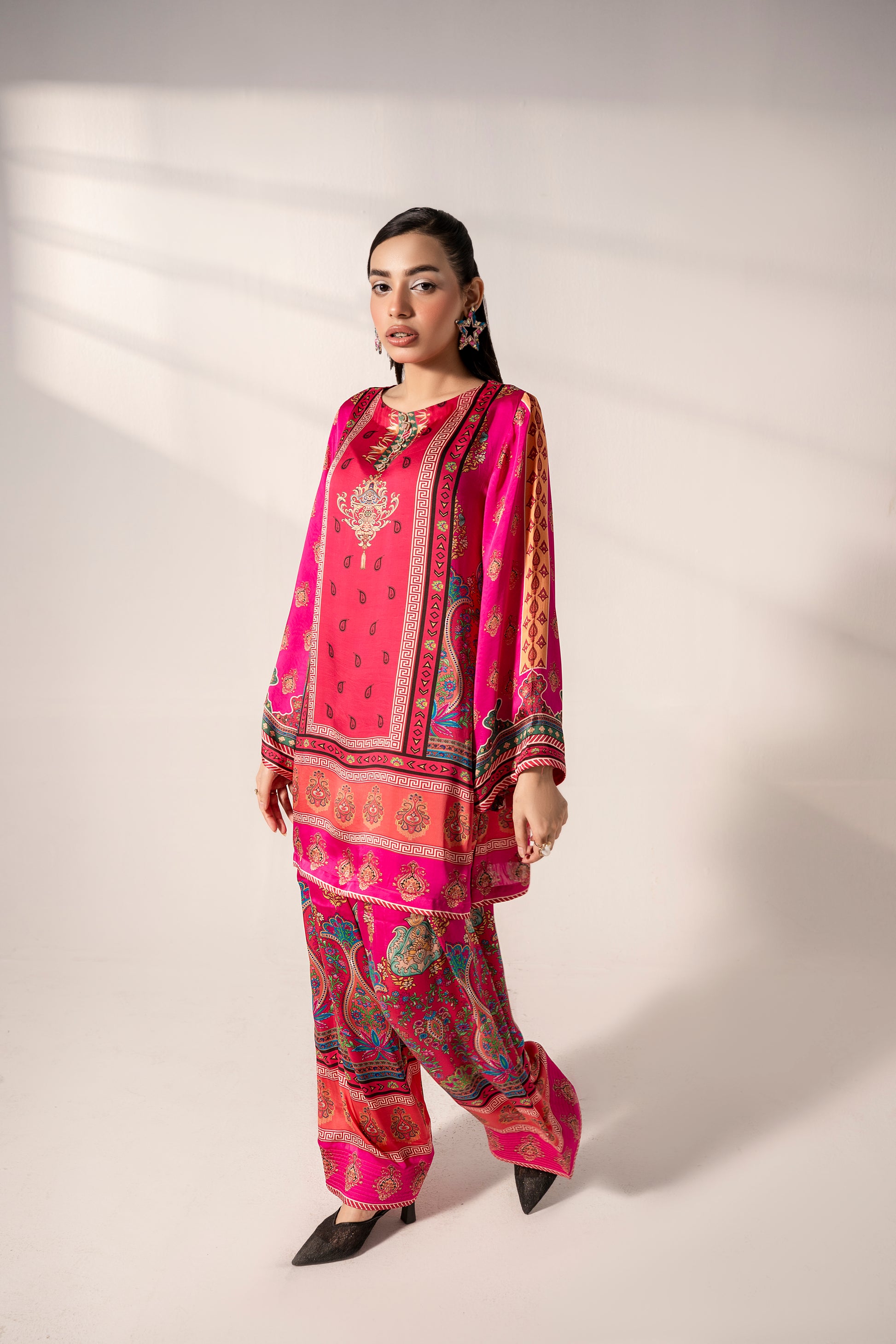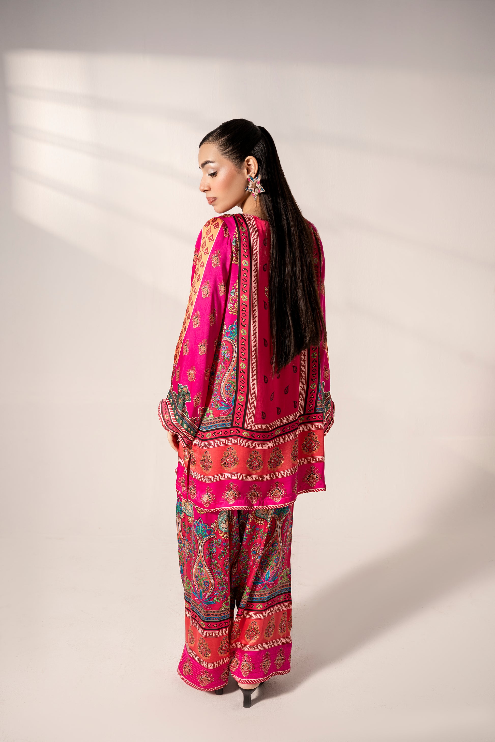 tep into timeless elegance with Imperial Bloom, a statement co-ord set crafted from the finest silk. Designed in a radiant fuchsia base, this ensemble blooms with intricate paisley and ornamental patterns in hues of turquoise, gold, and coral, creating a perfect balance of vibrance and sophistication.