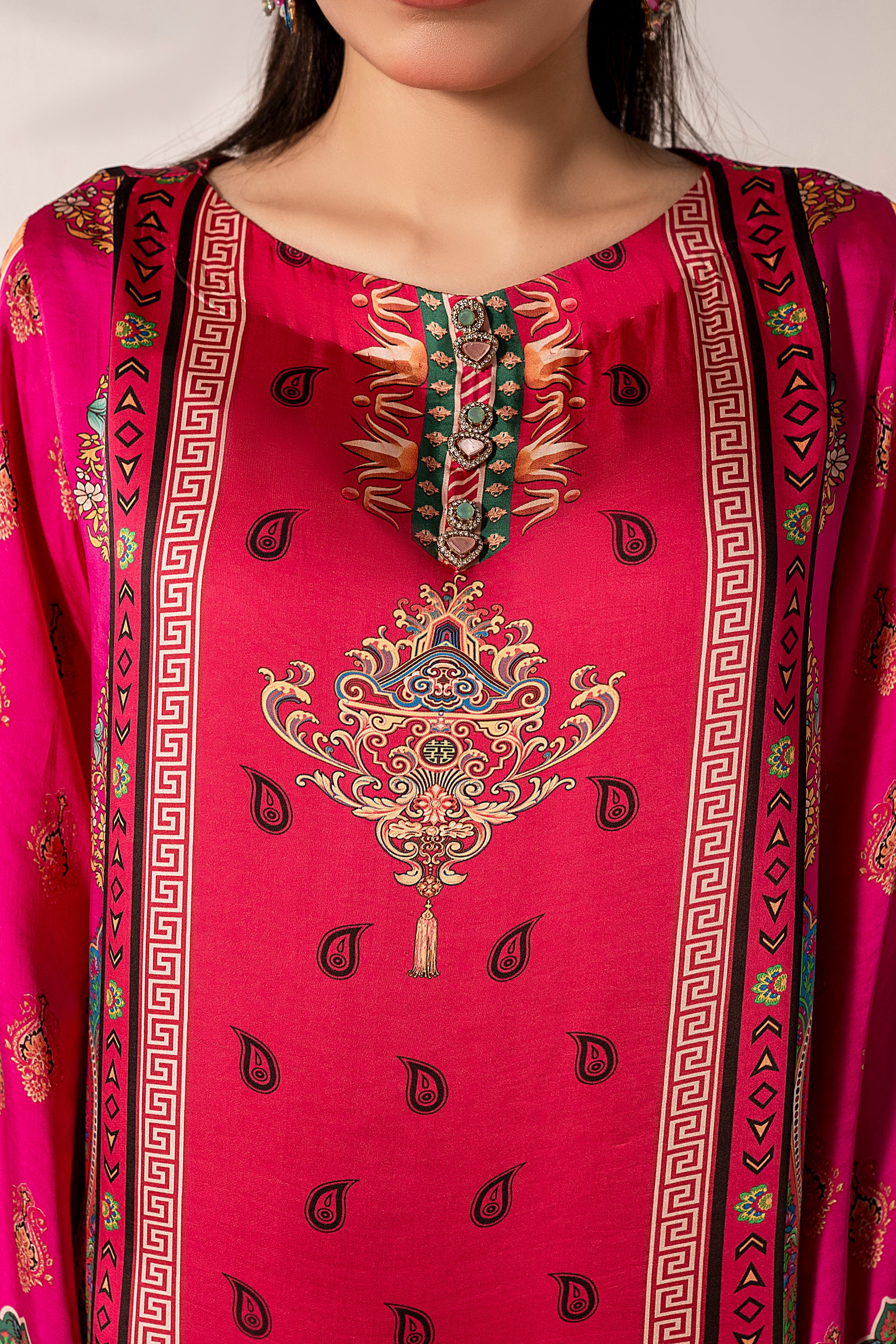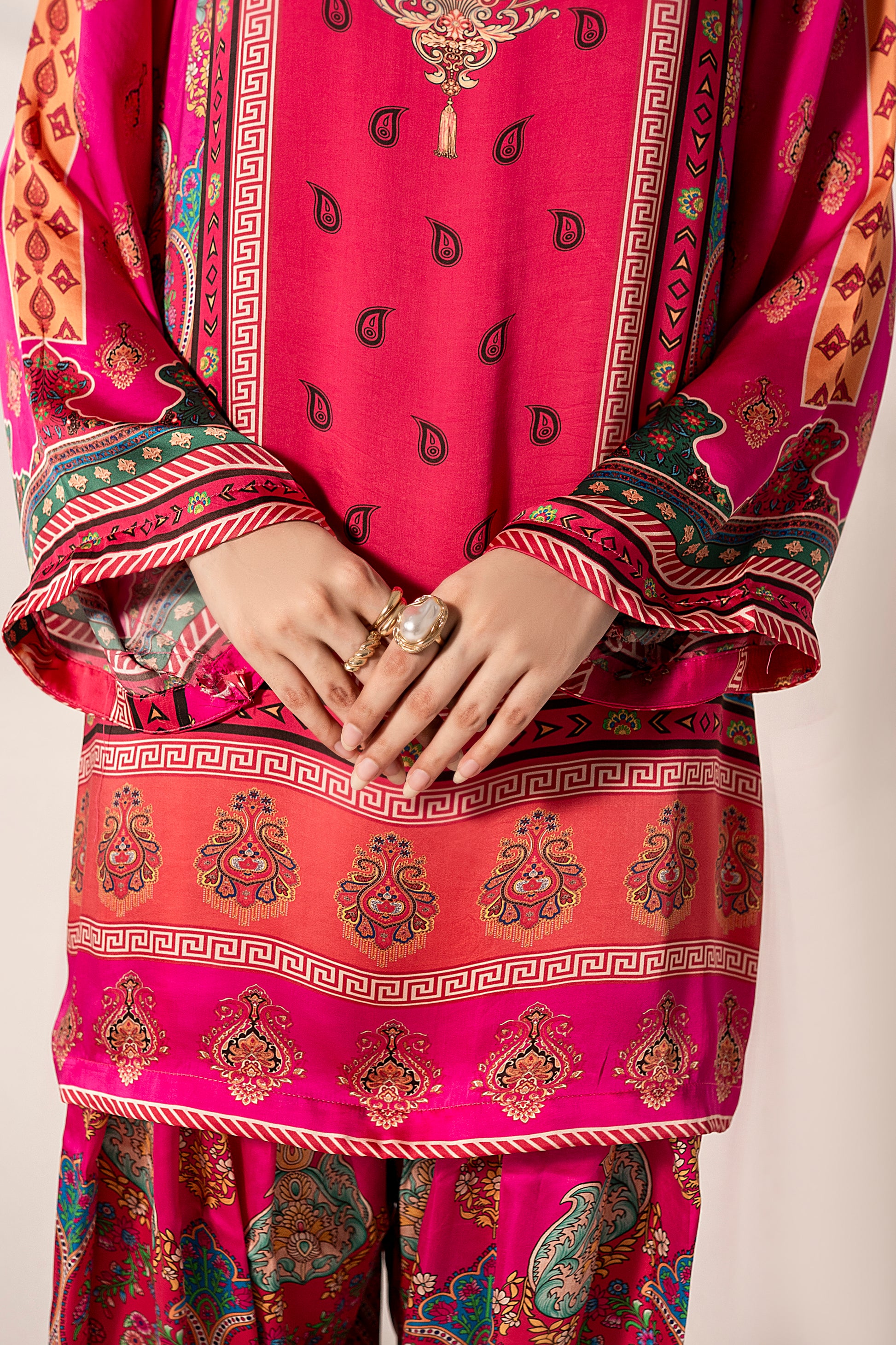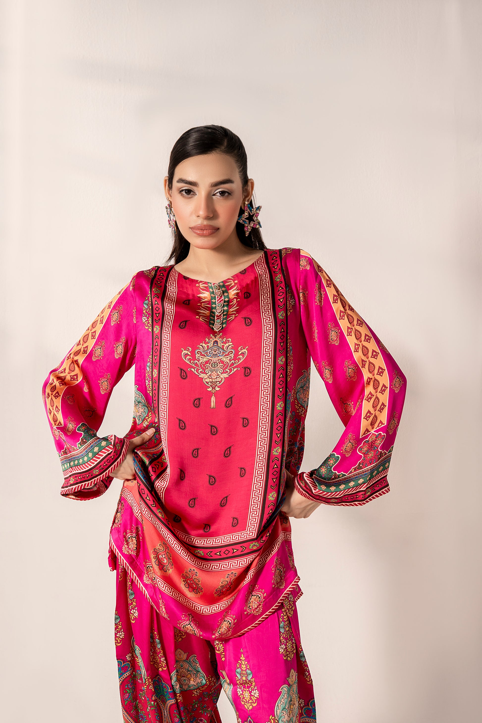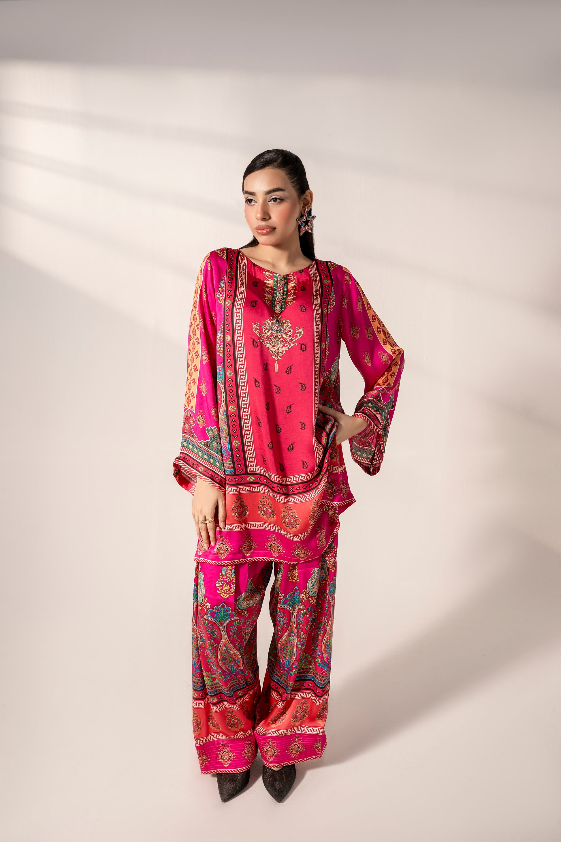 tep into timeless elegance with Imperial Bloom, a statement co-ord set crafted from the finest silk. Designed in a radiant fuchsia base, this ensemble blooms with intricate paisley and ornamental patterns in hues of turquoise, gold, and coral, creating a perfect balance of vibrance and sophistication.