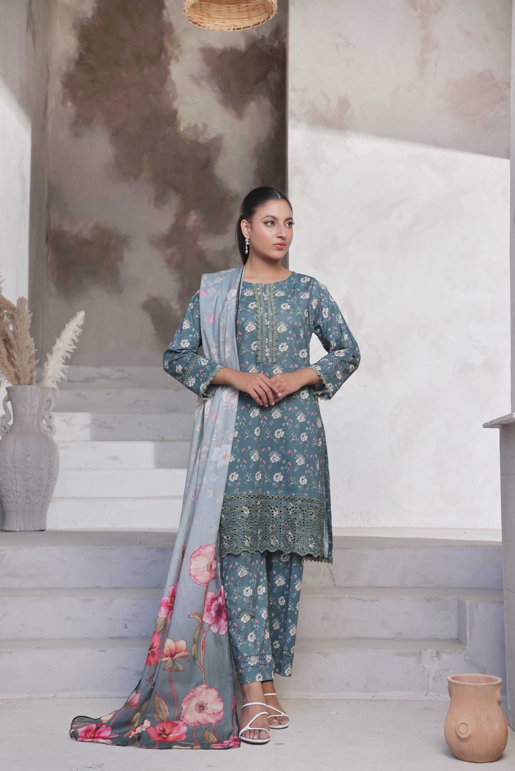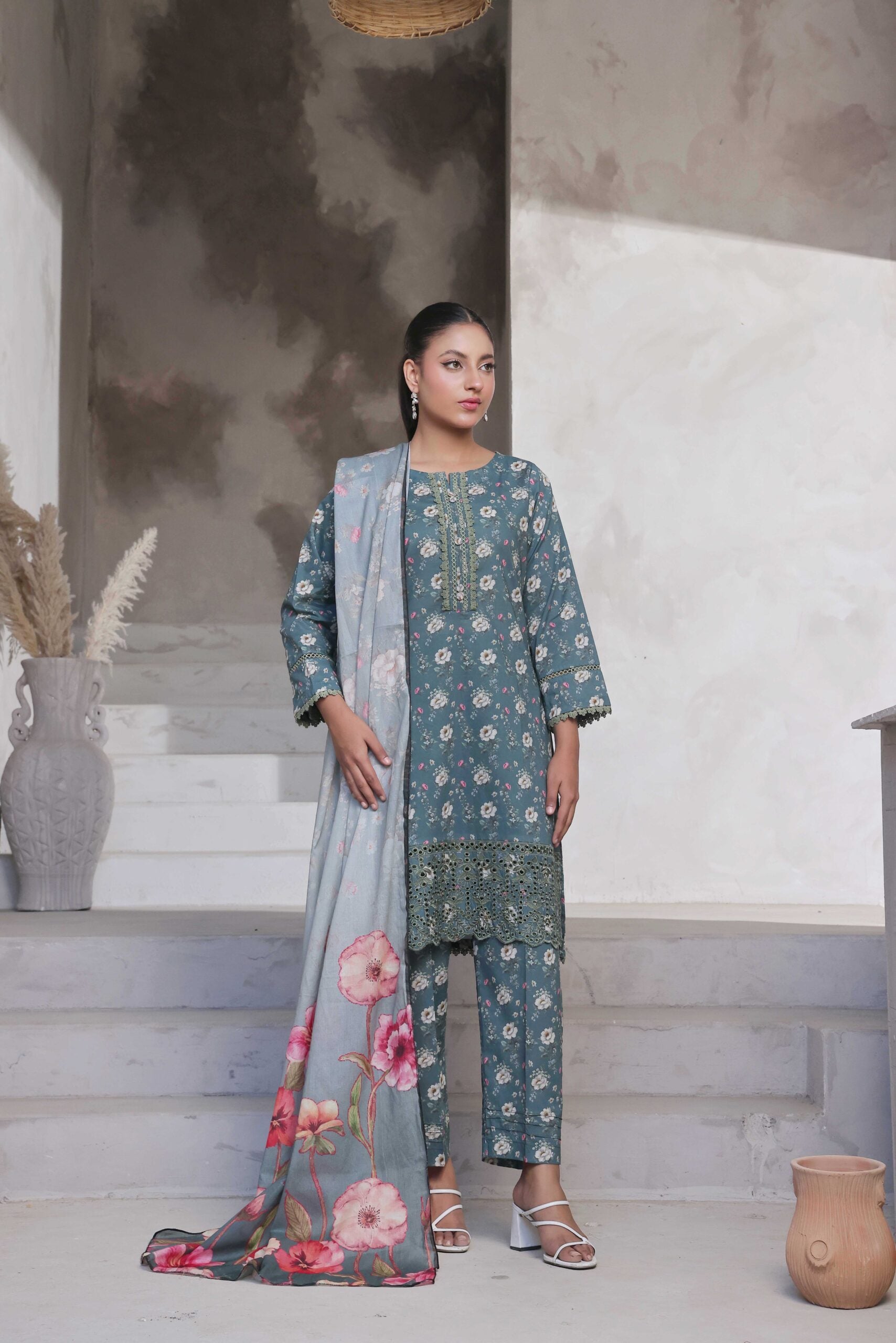 Printkari Festive Collection Fabric: Lawn embroidered shirt Dupatta: Digital print lawn dupatta Trouser: Printed trouser Design: Lace embellishment