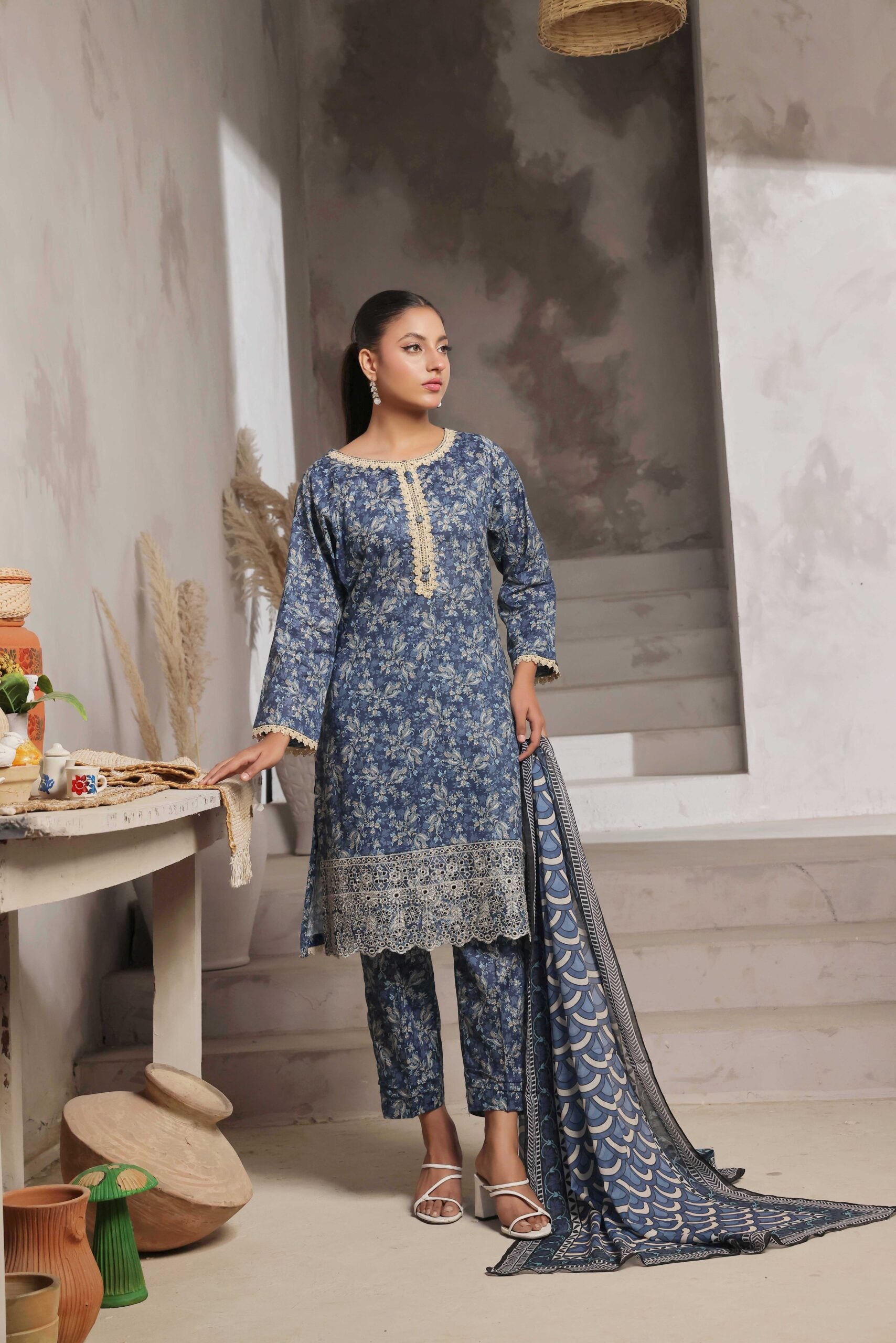 Printkari Festive Collection Fabric: Lawn embroidered shirt Dupatta: Digital print lawn dupatta Trouser: Printed trouser Design: Lace embellishment