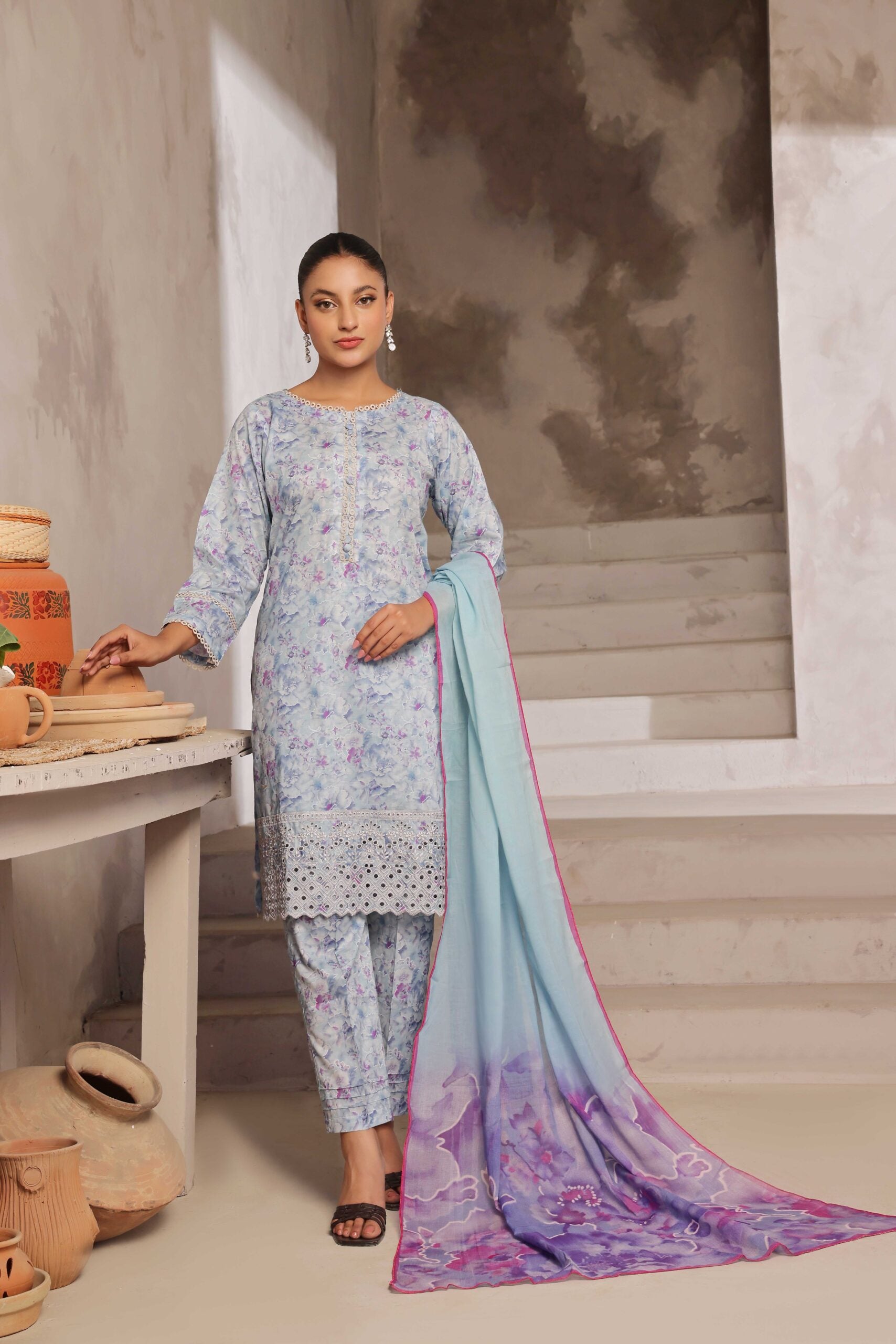 Printkari Festive Collection Fabric: Lawn embroidered shirt Dupatta: Digital print lawn dupatta Trouser: Printed trouser Design: Lace embellishment