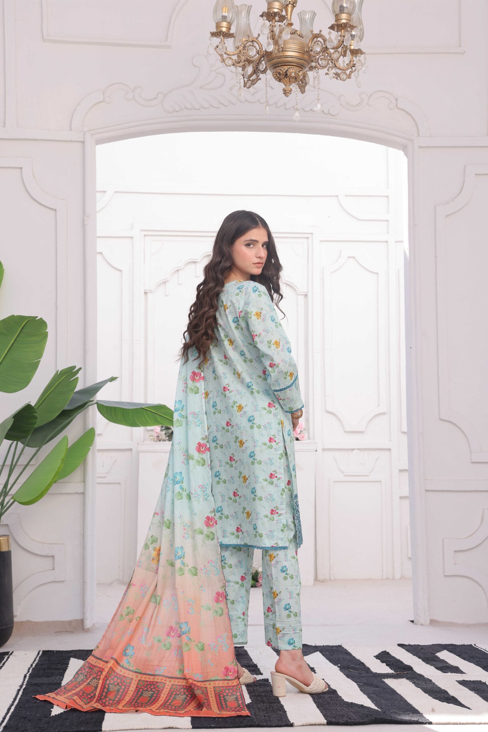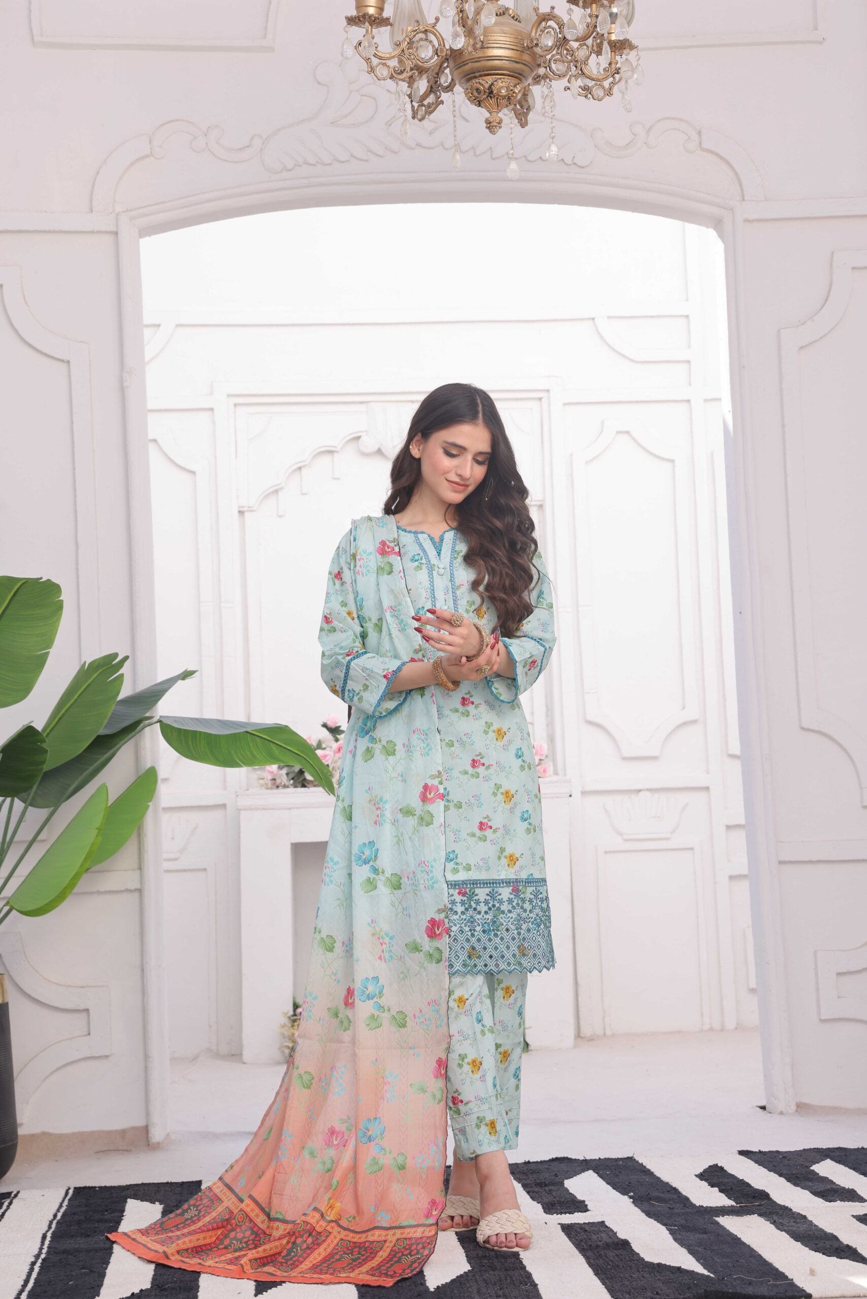 Printkari Festive Collection Fabric: Lawn embroidered shirt Dupatta: Digital print lawn dupatta Trouser: Printed trouser Design: Lace embellishment