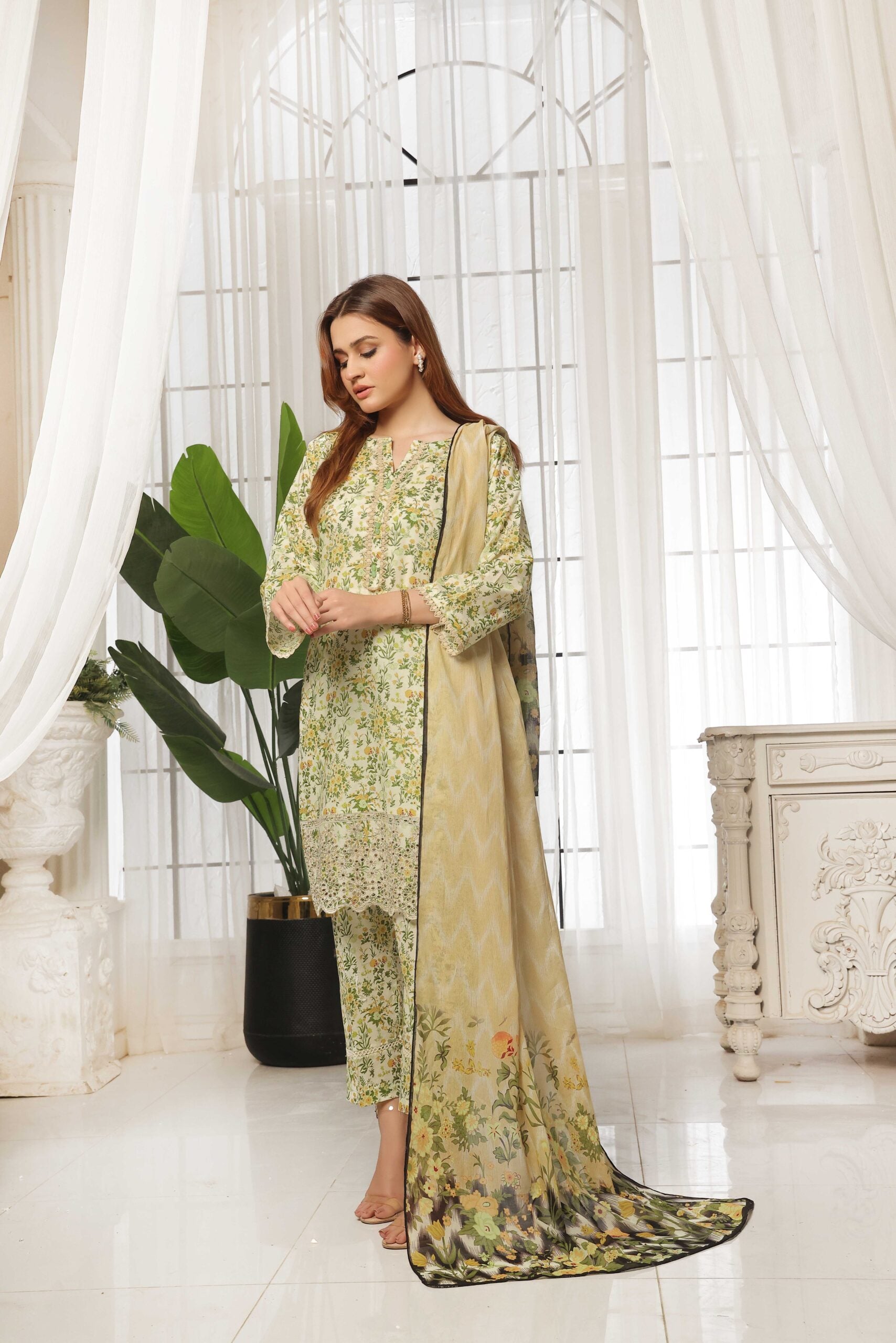 Printkari Festive Collection Fabric: Lawn embroidered shirt Dupatta: Digital print lawn dupatta Trouser: Printed trouser Design: Lace embellishment
