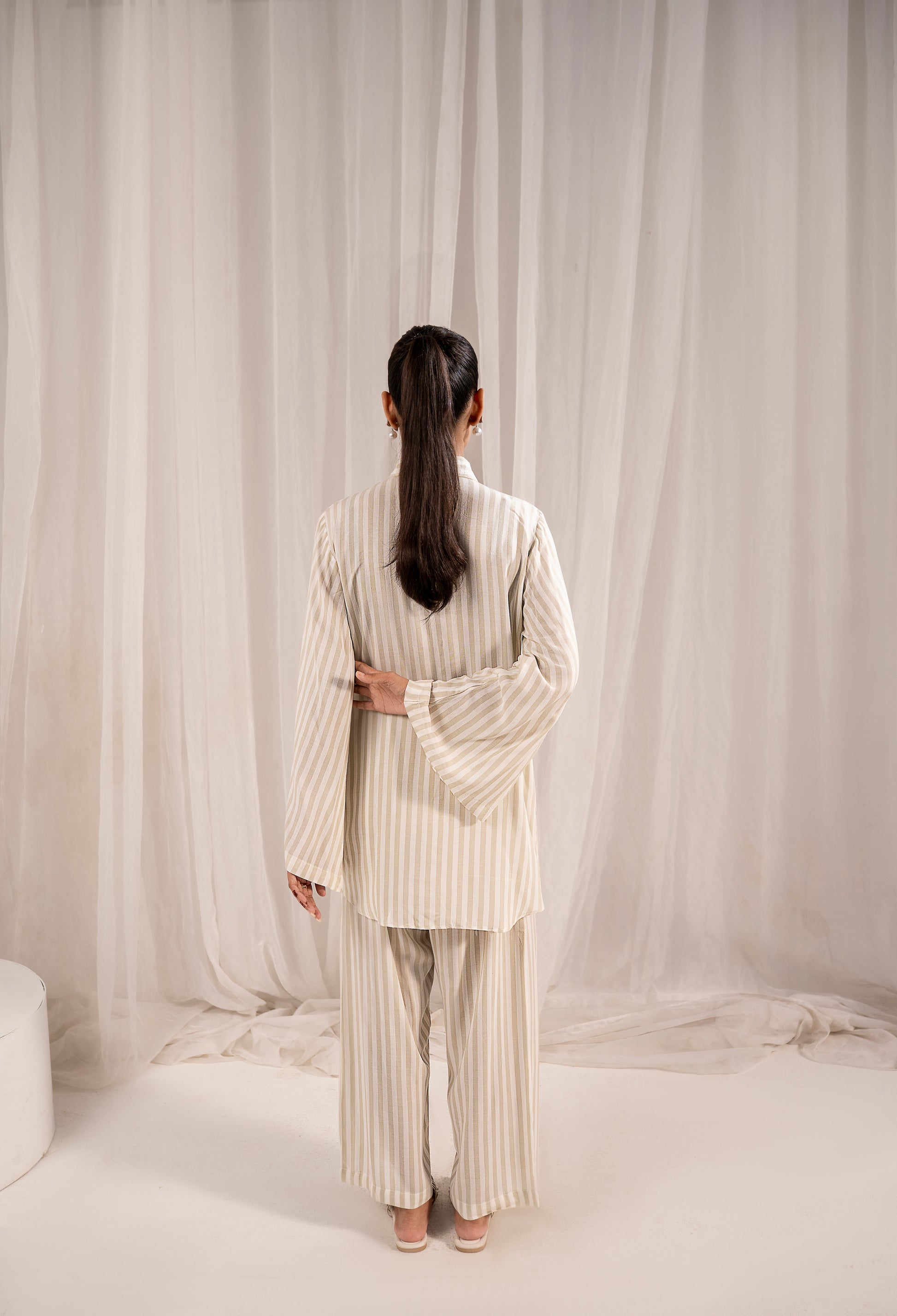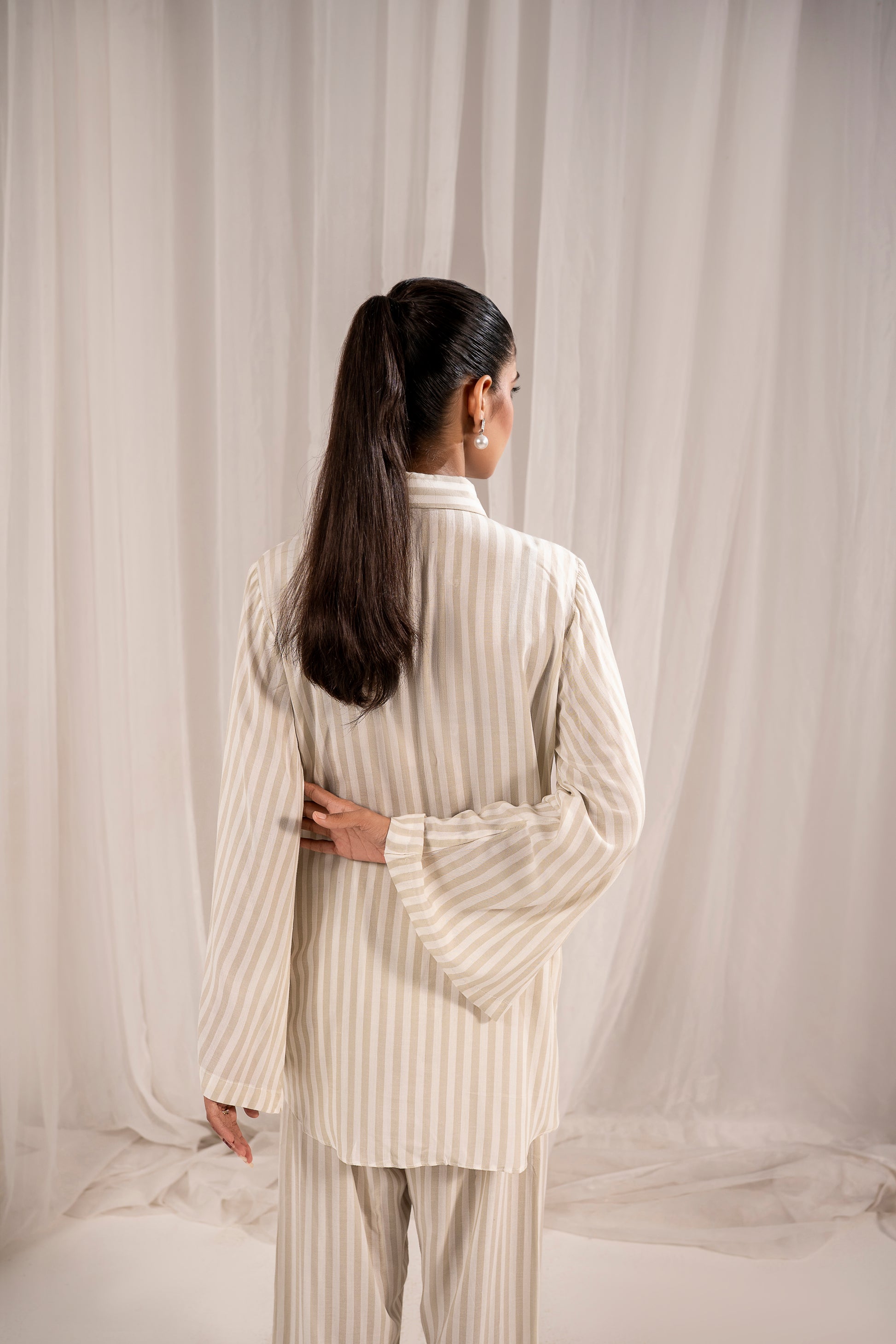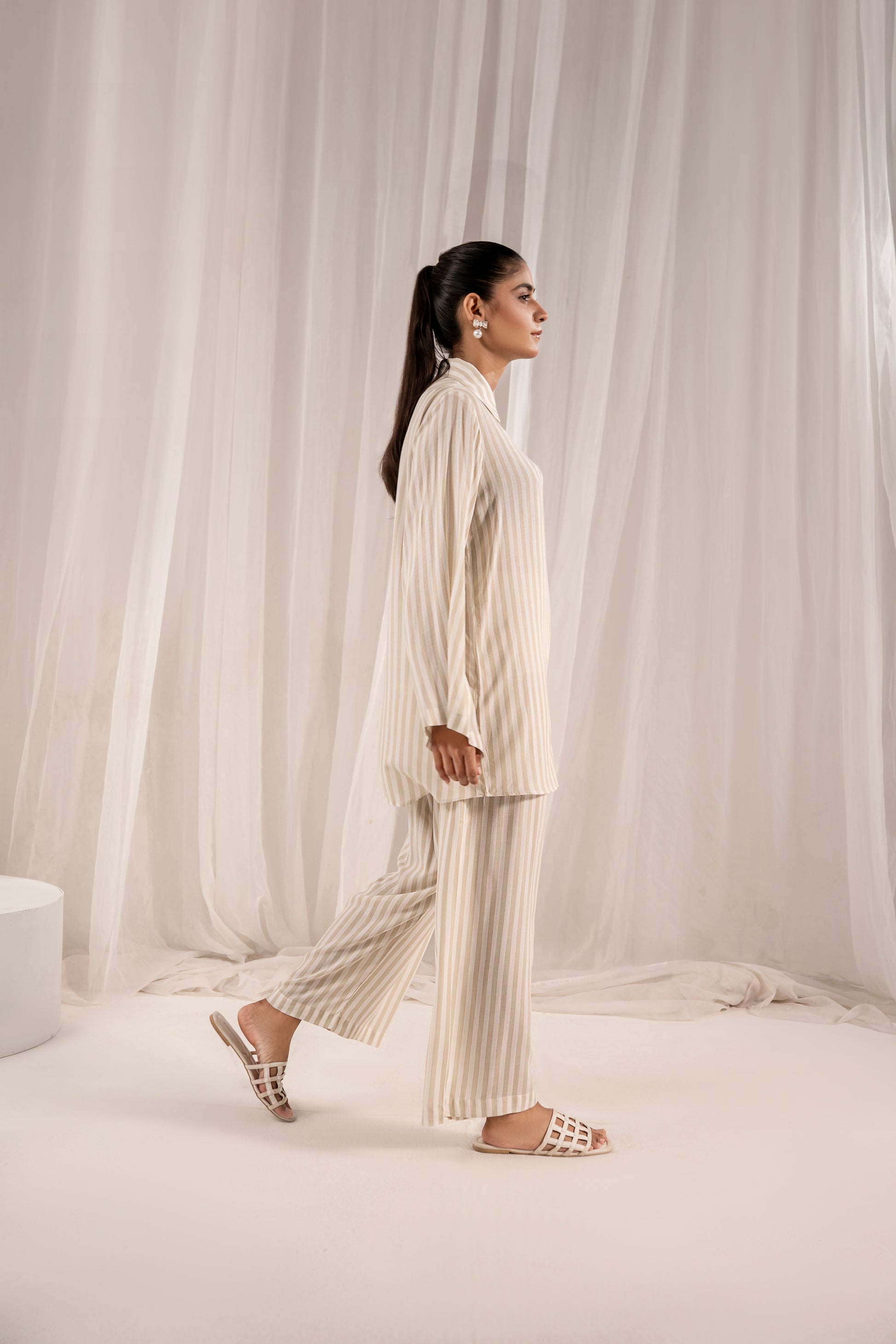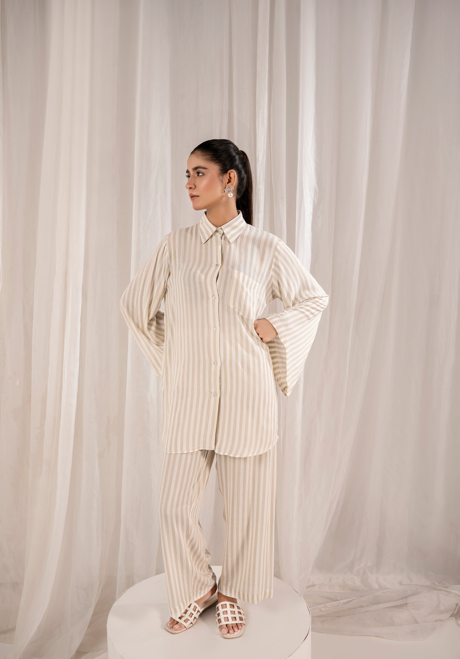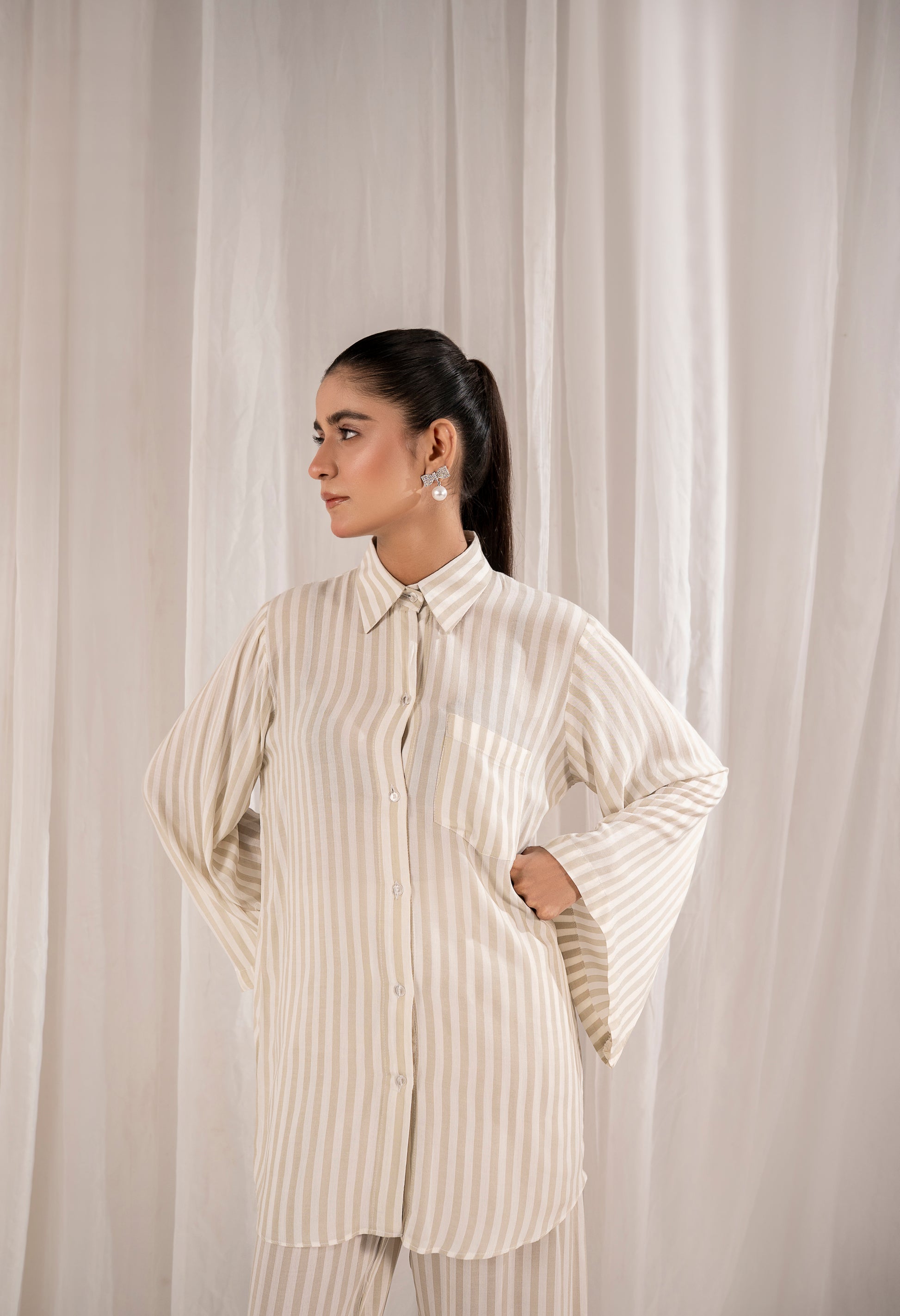 Crafted in breathable fabric with soft vertical stripes, the set features a button-down long shirt with a relaxed silhouette and flared sleeves, paired with matching straight pants for a sleek, coordinated look. Perfect for daytime elegance or casual evenings, this piece redefines understated luxury.