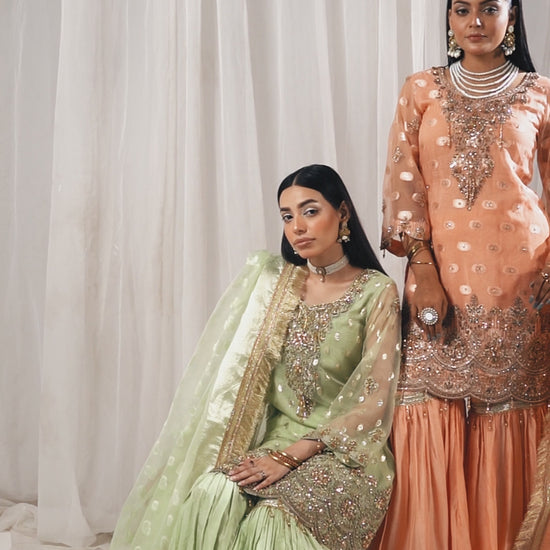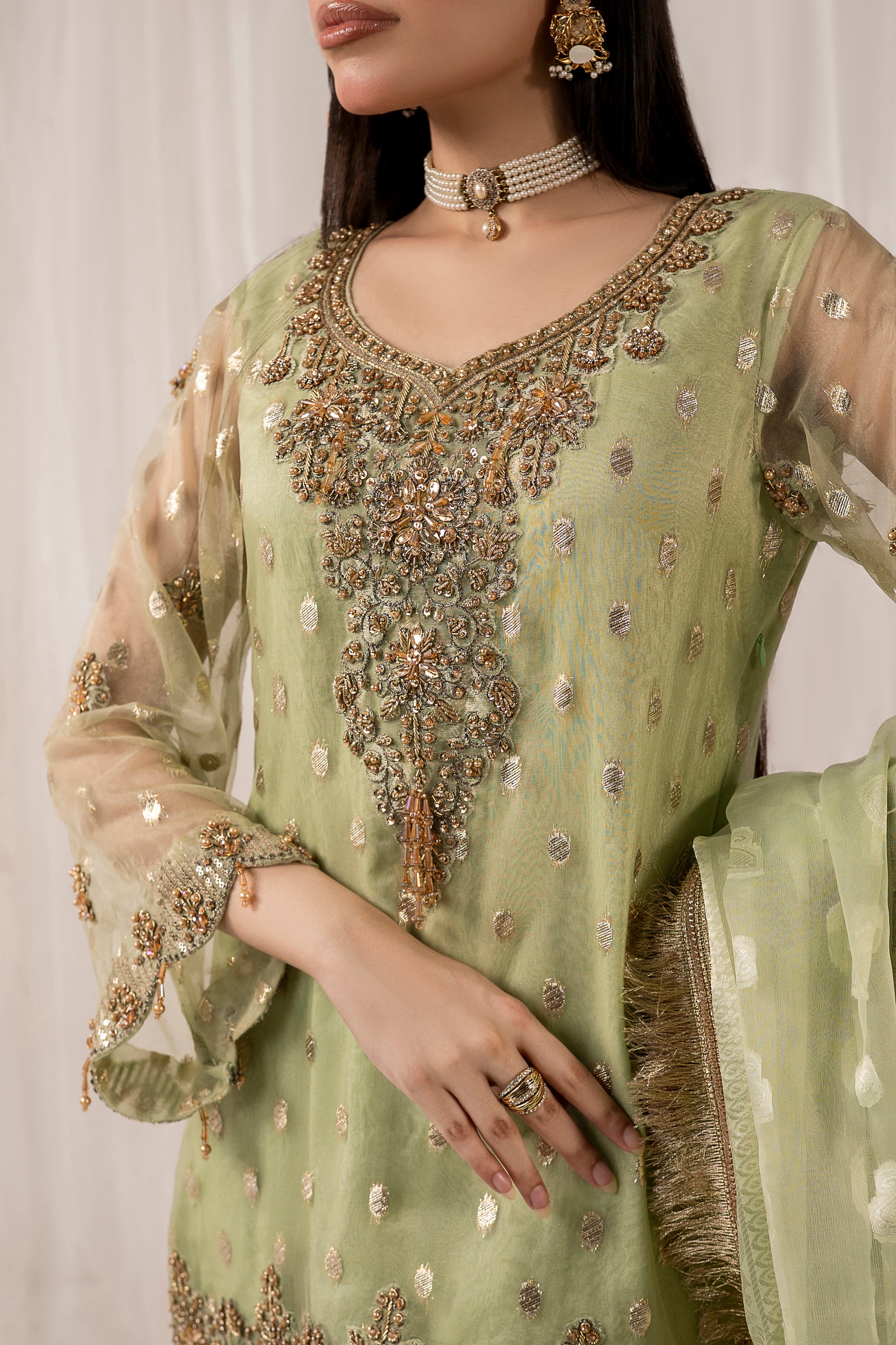 Fresh as morning dew, regal as tradition — Zariah returns in a divine shade of soft mint, graced with antique gold artistry.